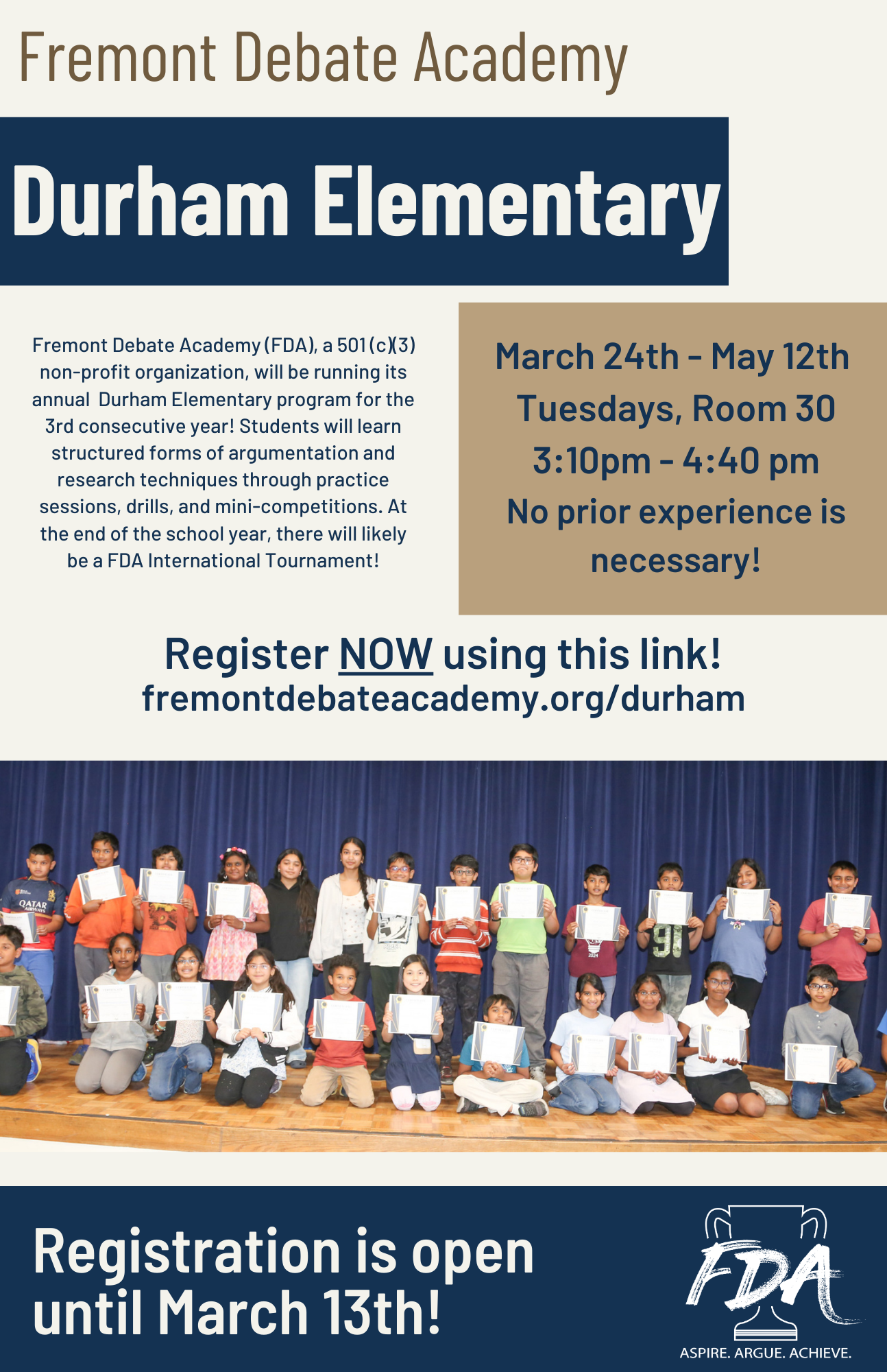 FDA Durham Elementary Debate sessions will be held on Tuesdays from 3:10pm to 4:40pm. There will be 8 classes for this program. The start date for the sessions will be March 24th in Room 30. Our last session will be on May 19th. Note: Parents are responsible for picking their children up promptly at 4:40 PM right after the session. Students may stay in Room 30 with Ms. Fowlks before the program officially starts at 3:10 PM.
